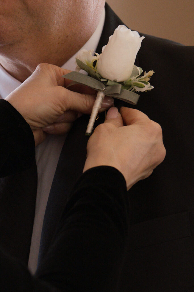 Hair being curled. Makeup touched up. Fathers adjusting boutonnieres.